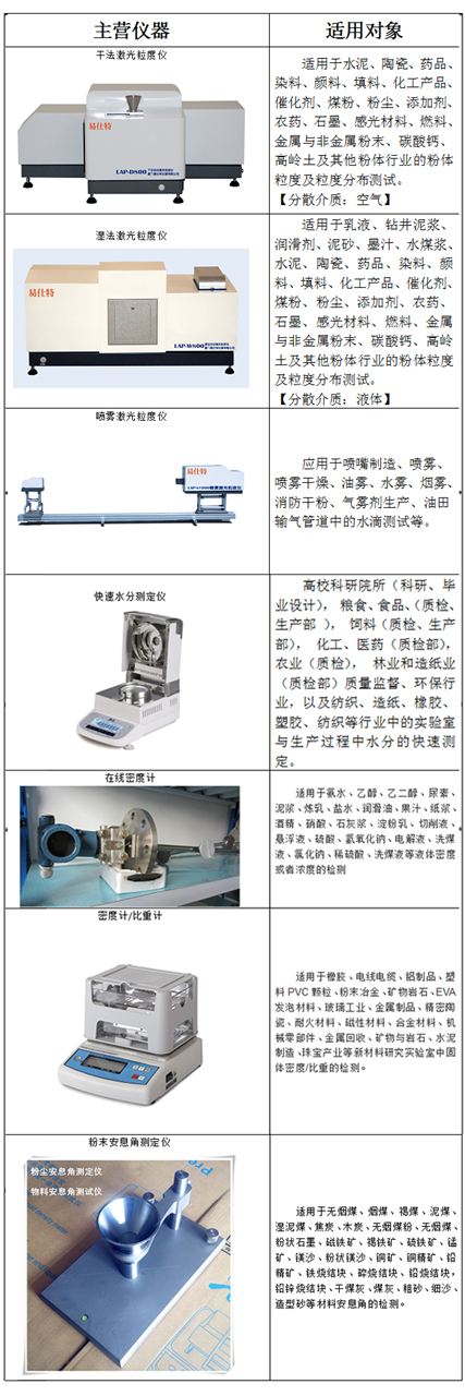 廈(shà)門易仕特儀器(qì)有限公司座落(luo)于風景秀麗的(de)經濟特區—廈門(men),易仕特緻力于(yú)各種快速分析(xi)檢測技術的創(chuang)新和應用,是集(jí)研發、制造、銷售(shou)和服務爲一體(ti)的綜合性高新(xin)技術企業。易仕(shì)特堅守“E-、A-*、S-标準、T-可信”的東方(fāng)儀器制造精神(shen),爲客戶提(tí)供的測試方案(an)和高品質産品(pǐn)。易仕特主營産(chǎn)品包括幹法激(ji)光粒度儀,濕法(fǎ)激光粒度儀,幹(gan)濕一體激光粒(li)度儀,噴霧激光(guang)粒度儀,圖像粒(li)度分析儀,固體(tǐ)密度計,液體密(mi)度💋計,在線密🚩度(dù)計,快速水分測(cè)試儀,粉末測試(shì)儀器等等檢測(ce)設備。以下是易(yi)仕特主營産品(pǐn)适用範圍。