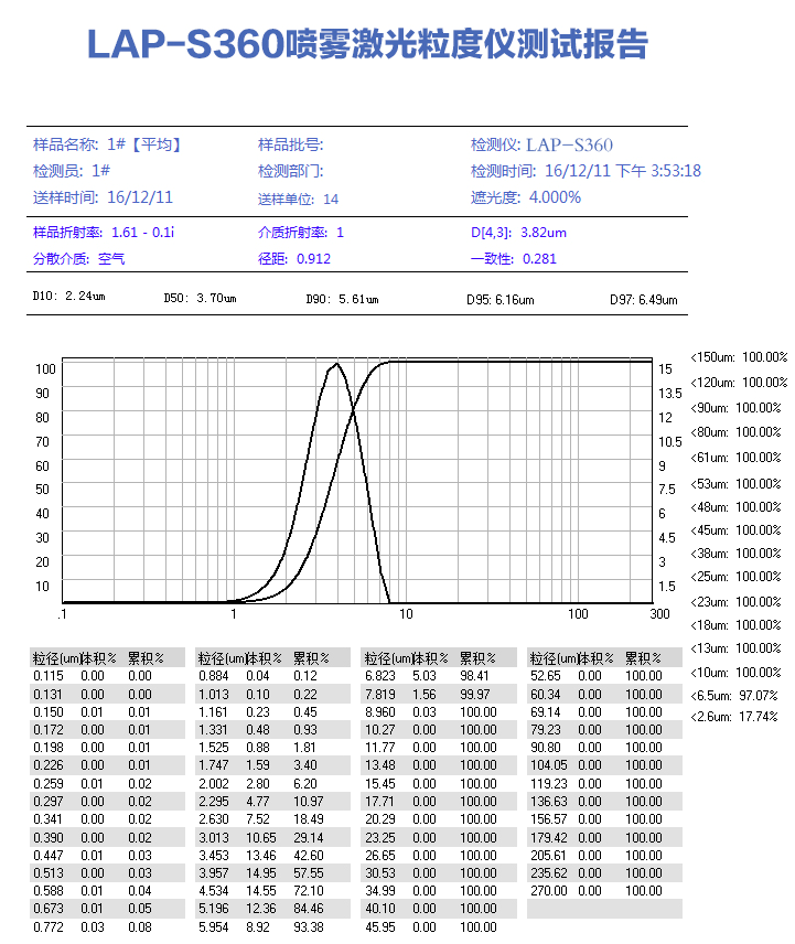超寬量程:LAP-S360的(de)設計量程達到了(le)~270μm,能夠滿(mǎn)足噴霧設備領域(yù)内絕大多數用戶(hu)的粒度測試🛀需求(qiu)。