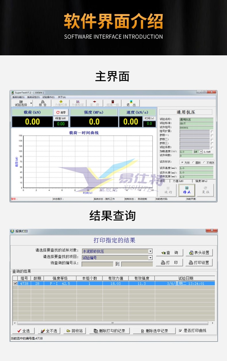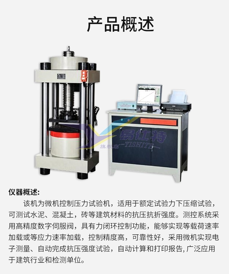 儀器概述:該機(ji)爲數顯電液伺(si)服壓力試驗機(ji),适用于額定試(shi)驗力下壓縮試(shi)驗,可測試水泥(ni)、混凝土,磚等建(jiàn)築材料的抗壓(yā)抗折強度。測控(kòng)系統采用高精(jīng)度數字伺服閥(fá),具有力閉環控(kong)🔞制功能⁉️,能夠實(shi)現等載荷速率(lǜ)加載或等應力(lì)速率加載,控制(zhì)精度高,可靠性(xìng)好,采用微機實(shi)現電👌子測量、自(zì)動完成抗壓強(qiáng)度試驗,自動⛷️計(jì)🧑🏽🤝🧑🏻算和打印報告(gao),廣泛應用 于建(jian)築行業和檢測(cè)🛀單位。