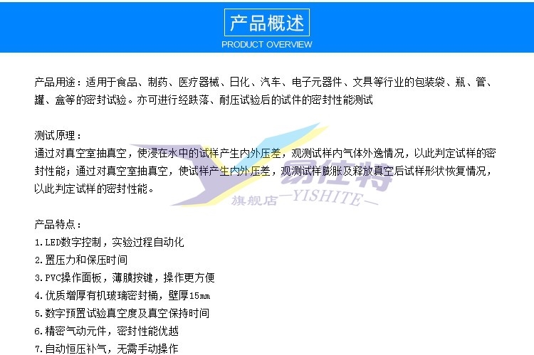 真(zhen)空密封(feng)性能測(ce)試儀适(shì)用于食(shí)品、制藥(yào)、醫療器(qi)械、日化(huà)、汽車、電(diàn)子元器(qi)件、文具(ju)等行業(yè)的包裝(zhuāng)袋、瓶、管(guan)、罐、盒等(děng)的♊密封(fēng)試驗。亦(yì)可進行(háng)經跌落(luo)、耐壓試(shi)驗後的(de)試件☔的(de)密封💯性(xìng)能測試(shi)